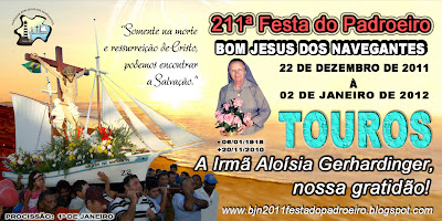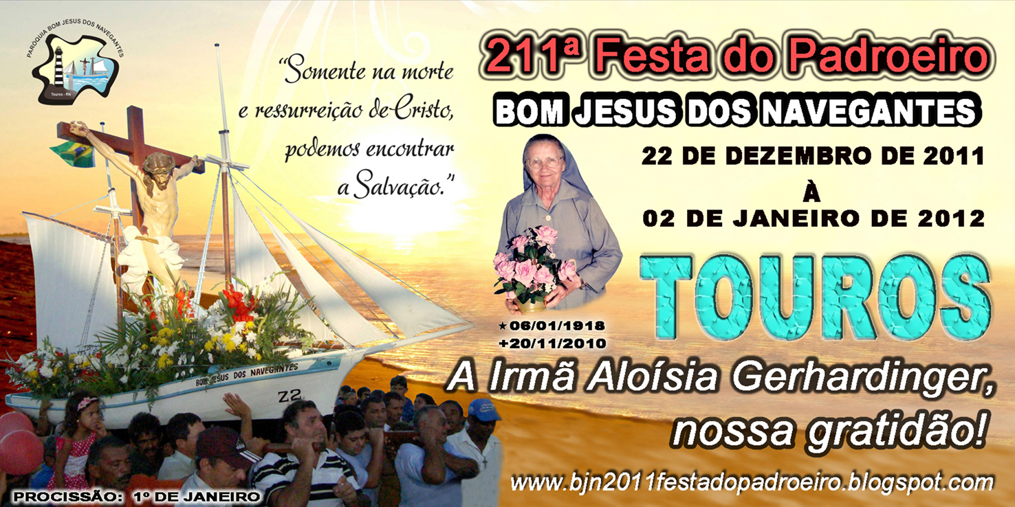 A Paróquia de Touros, iniciará a Festa do seu Padroeiro, nesta quinta-feira(22), a partir da 17 horas, quando o padre Josenildo Bezerra dos Santos, abençoará os vaqueiros e animais para a I Cavalgada do Bom Jesus dos Navegantes, saindo da matriz, e seguirão pelas principais avenidas até a entrada da cidade, onde aguardarão a chegada da carreata com o Barco Peregrino, vindo do Distrito de Boa Cica. Os vaqueiros conduzirão a faixa de abertura da Festa e as bandeiras do Brasil, Estado e Município.